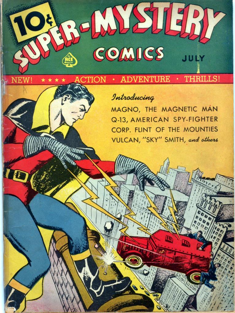 Son titre de super-héros le plus réussi et le plus long était Super-Mystery Comics, mettant en vedette Magno l’homme magnétique et son partenaire Davey, qui sont apparus dans 28 numéros sur les 48 numéros de la série. Magno est presque unique parmi les super-héros car il n’a ni origine pour ses pouvoirs ni aucune identité secrète apparente.